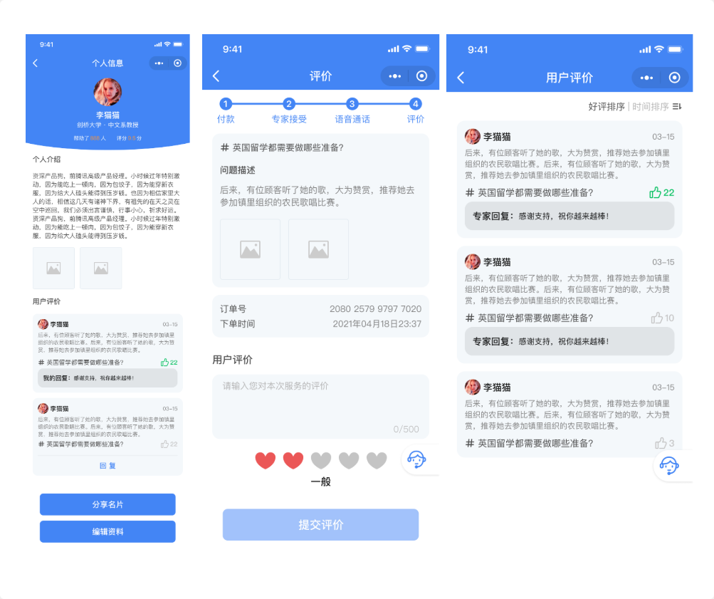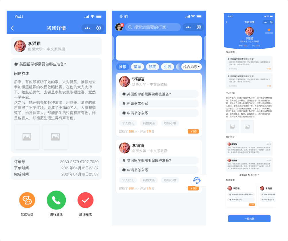 行家详情模块:用户可以查看行家的详细信息,包括其专业背景、经验和评价。用户可以通过约聊下单功能与行家预订服务,并在预订后进行语音通话、私信沟通以及确认订单完成。