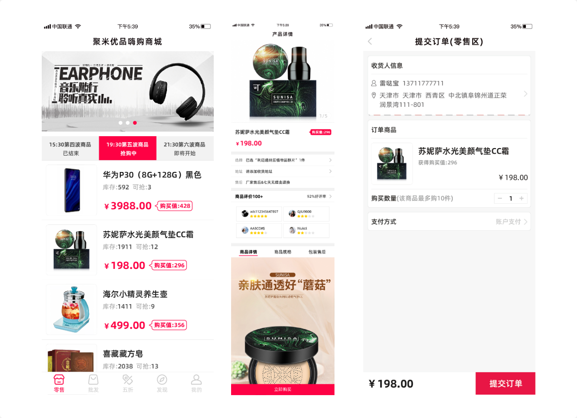 商品详情:在商品详情页,用户可以查看商品的更详细信息,包括规格、型号、用户评价等。用户可以选择商品的数量和属性,并进行下单操作。