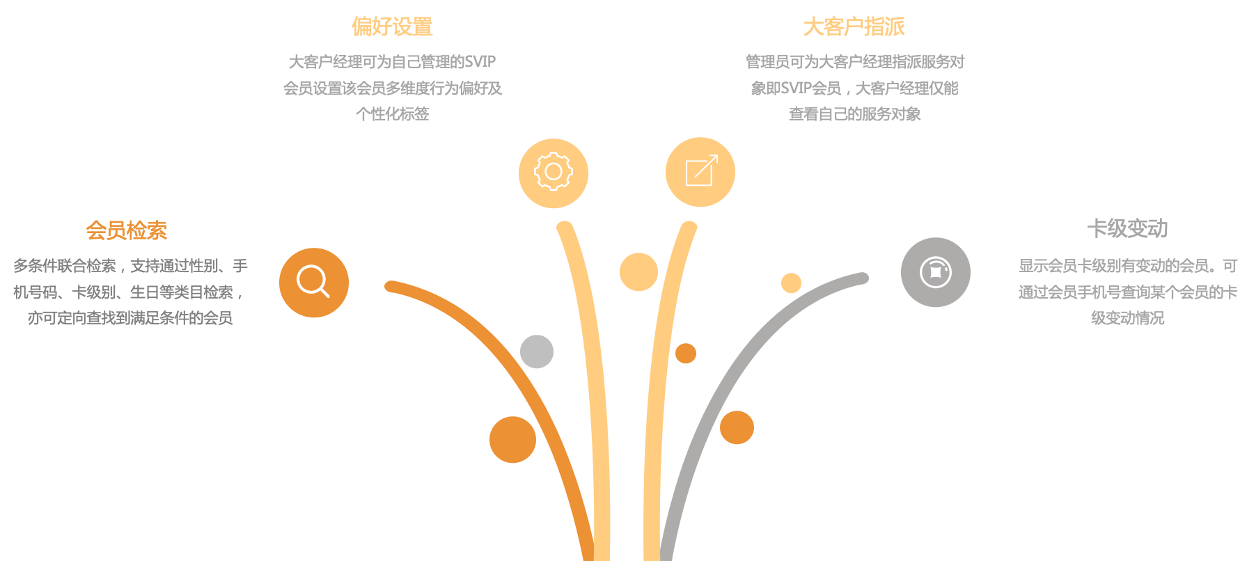该模块为核心会员数据模块,该模块由会员检索、偏好设置、大客户指派及卡级别变动查询等功能构成。