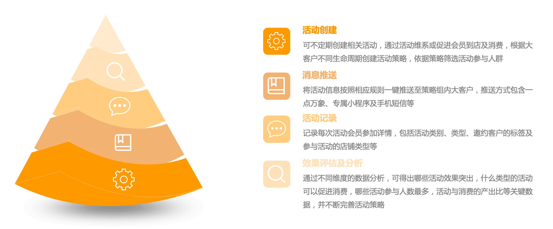根据活动策略选取与策略相匹配的大客户群组及参与活动的店铺,亦可根据大客户生命周期制定活动策略及参与店铺,并实现活动信息的一键精准推送,同时对活动效果进行全量数据分析及评估,根据其结果不断完善活动策略。