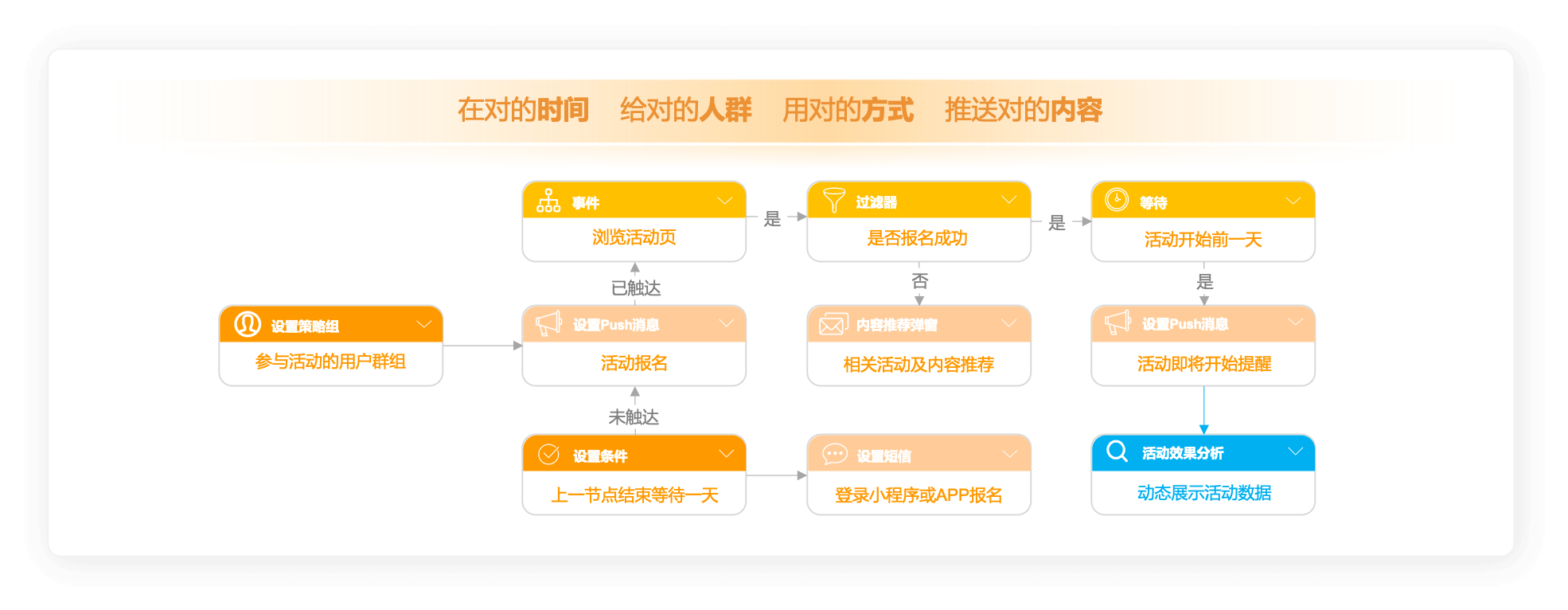 以用户为中心通过识别大客户生命周期的关键行为,判断行为触发因素与业务的相关性,通过定义触发器的规则,将其链接到适当的活动路径,利用活动管理工具优化行为触发营销,并依据营销目标需要拓展活动路径。