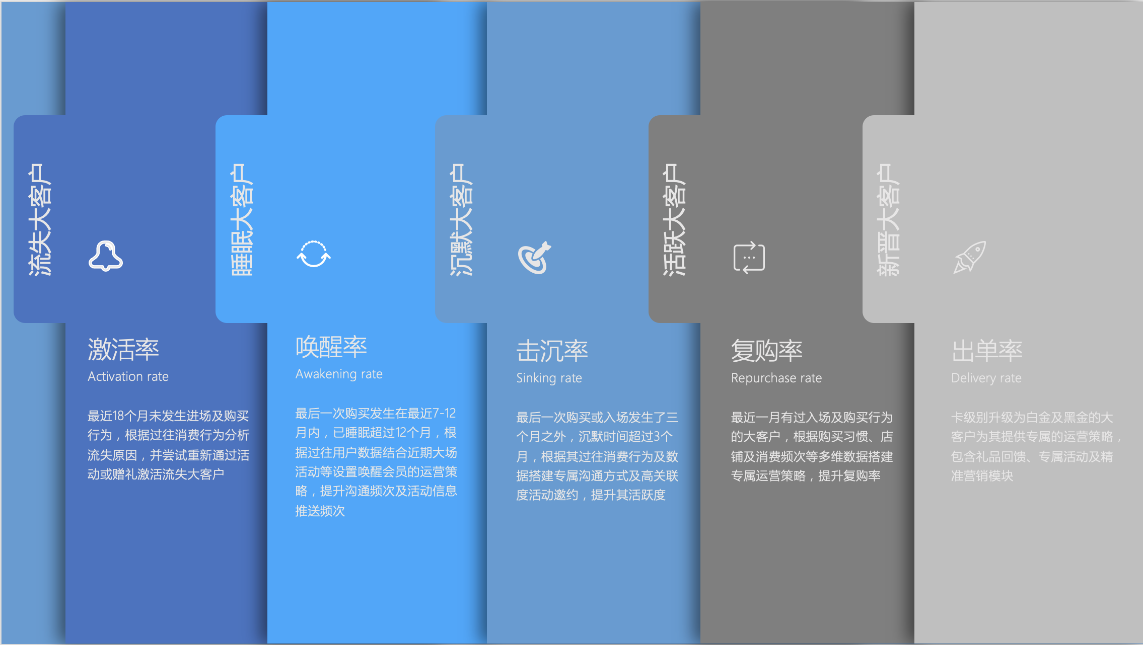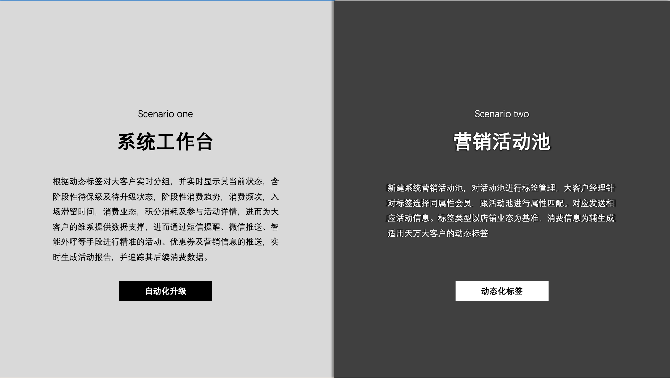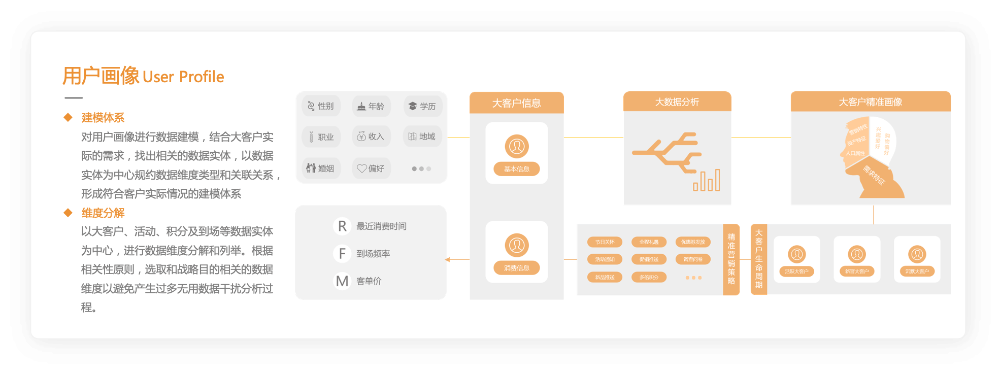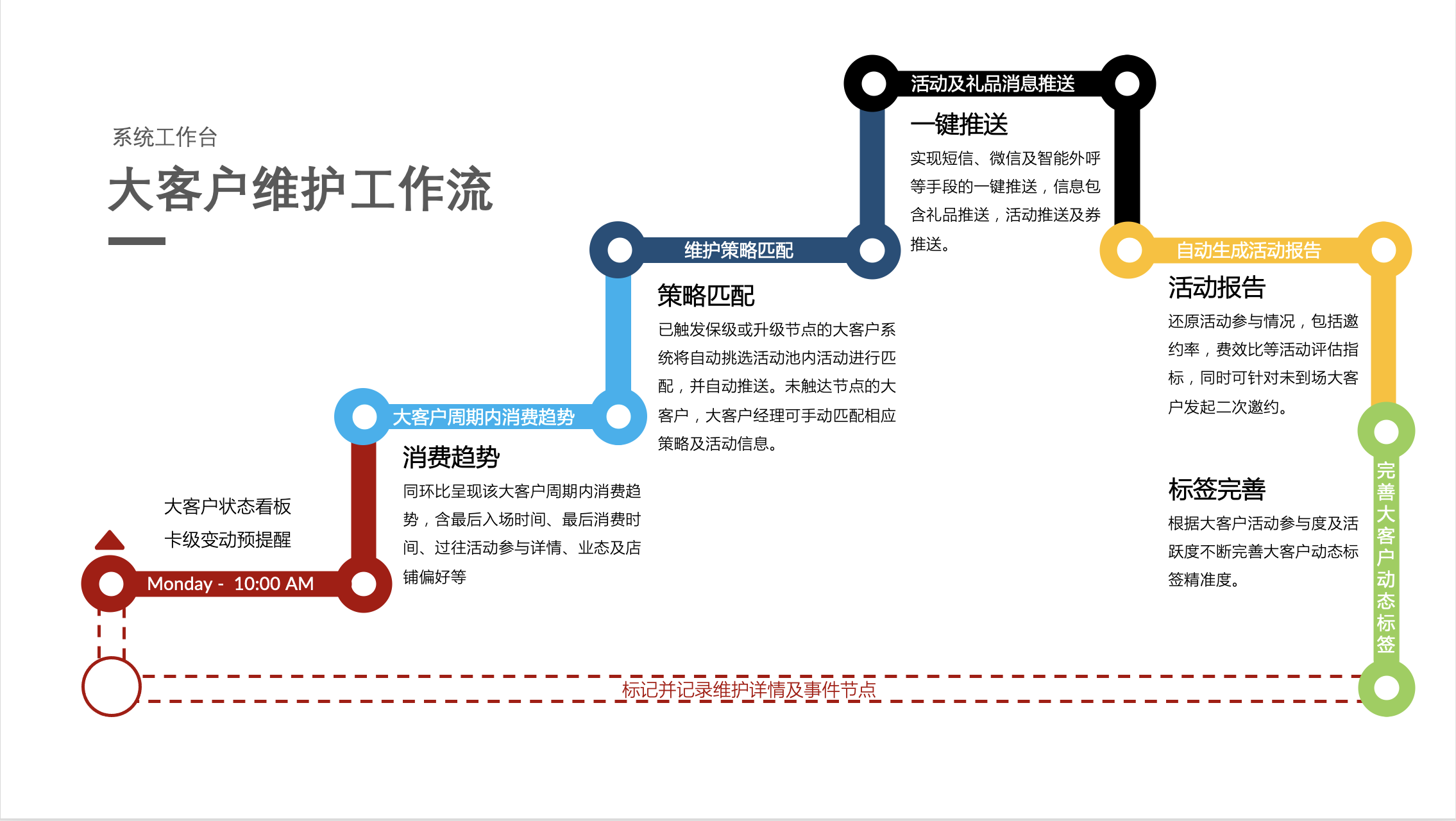 目前,针对于大客户的服务及维系仍停留在“大众化”的营销策略层面,所提供的服务亦多基于购物 打折、消费积分及积分兑礼等常规服务手段,难以满足大客户个性化需求和个性化的购物体验。该系 统设计初衷旨在强化原有服务便捷性及体贴度的基础上,通过分析大客户相关数据形成其基于行为偏 好的动态标签,结合会员生命周期管理针对不同大客户搭建定制化营销策略,并自动化执行,进而引 导大客户返场复购。