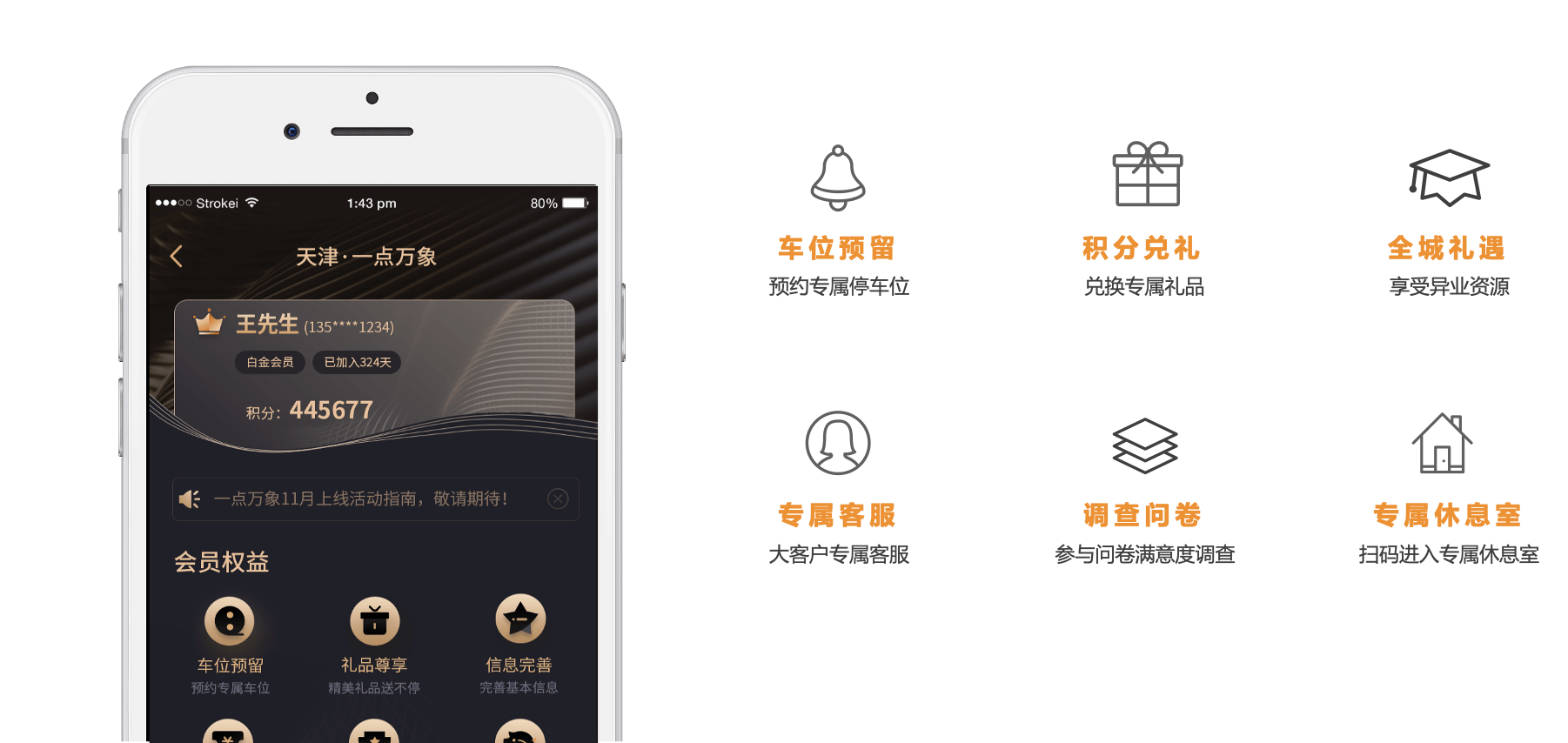 为大客户打造专属微信小程序前端,客户通过小程序可享受停车预约、积分兑礼、活动通知、全城礼遇、调查问卷、专属客服经理及VIP专属休息室等服务模块。