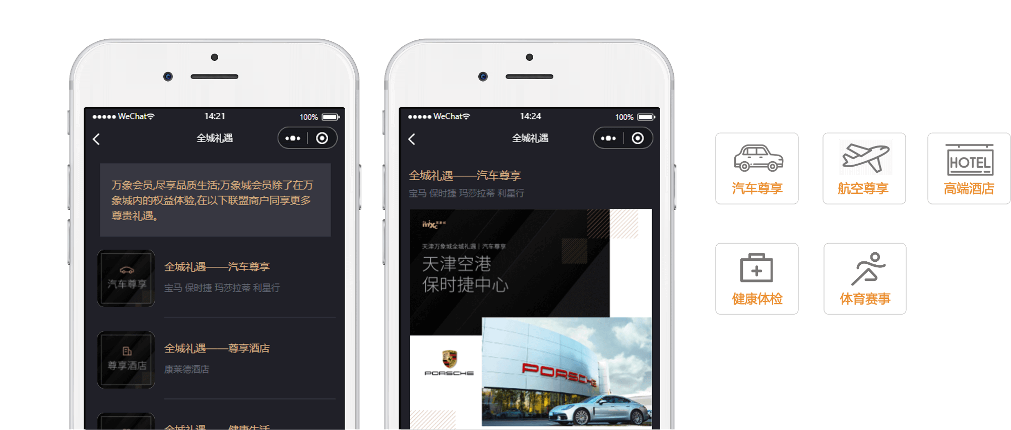 为SVIP客户提供全天津高端异业资源,SVIP客户可通过小程序查看及预约异业礼遇,亦可为异业合作伙伴定制专属页面,用于高端异业资源的整合及共享。