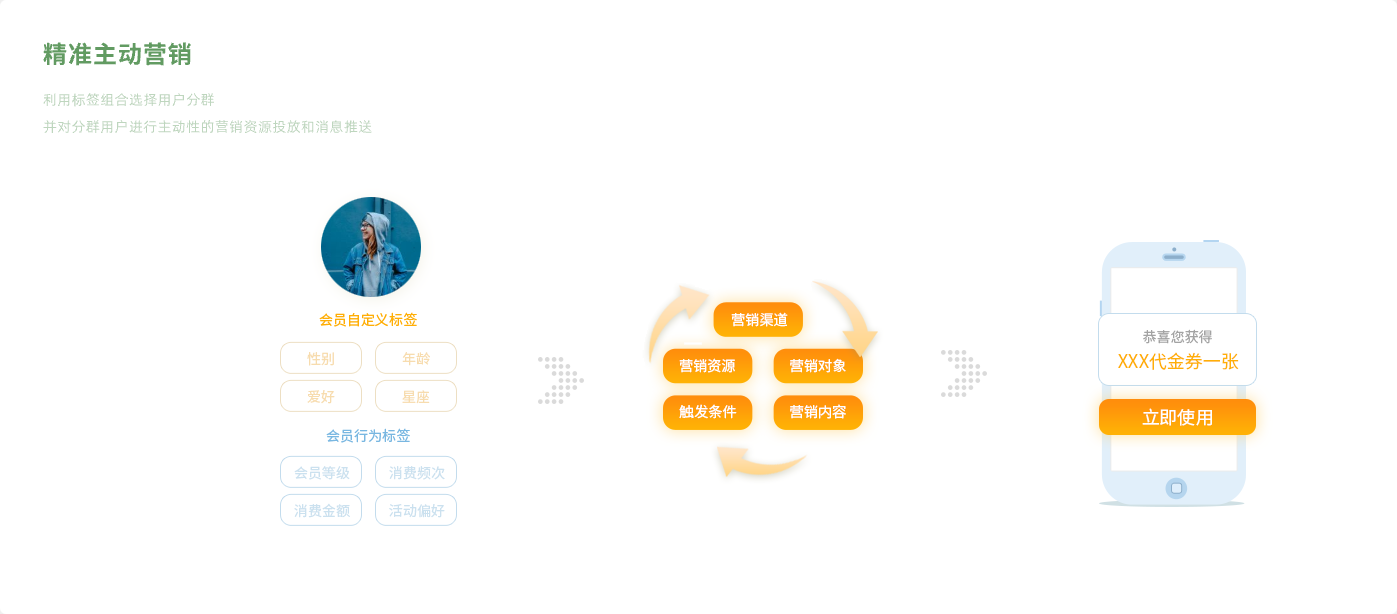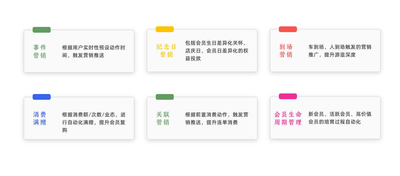 根据不同场景、不同用户对象预先设置有针对性的消息推送和权益发放,自动化执行。
