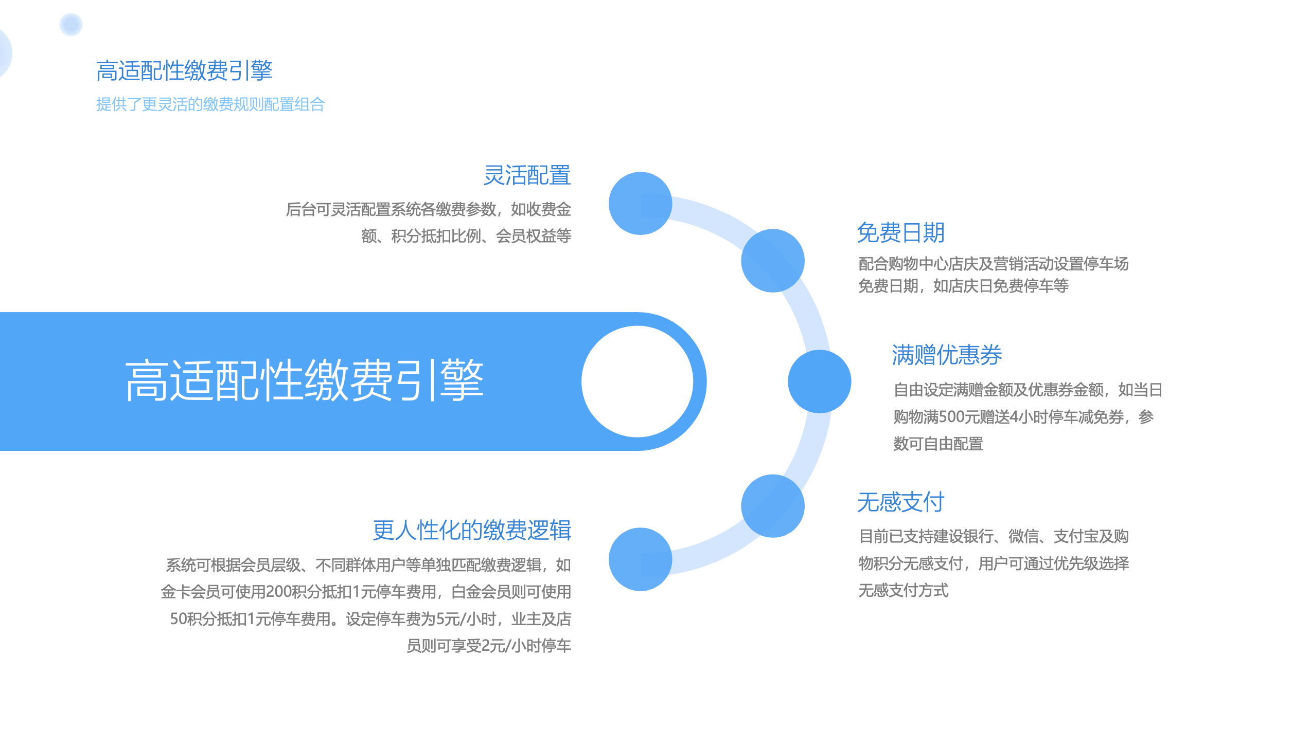 围绕提升运营效率、降低管理成本、提升用户体验及简化管理流程构建商业地产智慧停车体系通过打通购物中心会员体系、收银体系及营销活动体系等构建停车场辅助营销体系。