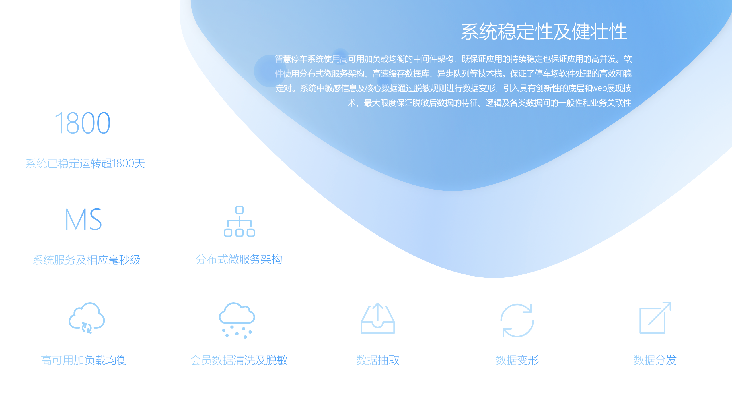 智慧停车系统使用高可用加负载均衡的中间件架构,既保证应用的持续稳定也保证应用的高并发。软 件使用分布式微服务架构、高速缓存数据库、异步队列等技术栈。保证了停车场软件处理的高效和稳 定对。系统中敏感信息及核心数据通过脱敏规则进行数据变形,引入具有创新性的底层和web展现技 术,最大限度保证脱敏后数据的特征、逻辑及各类数据间的一般性和业务关联性